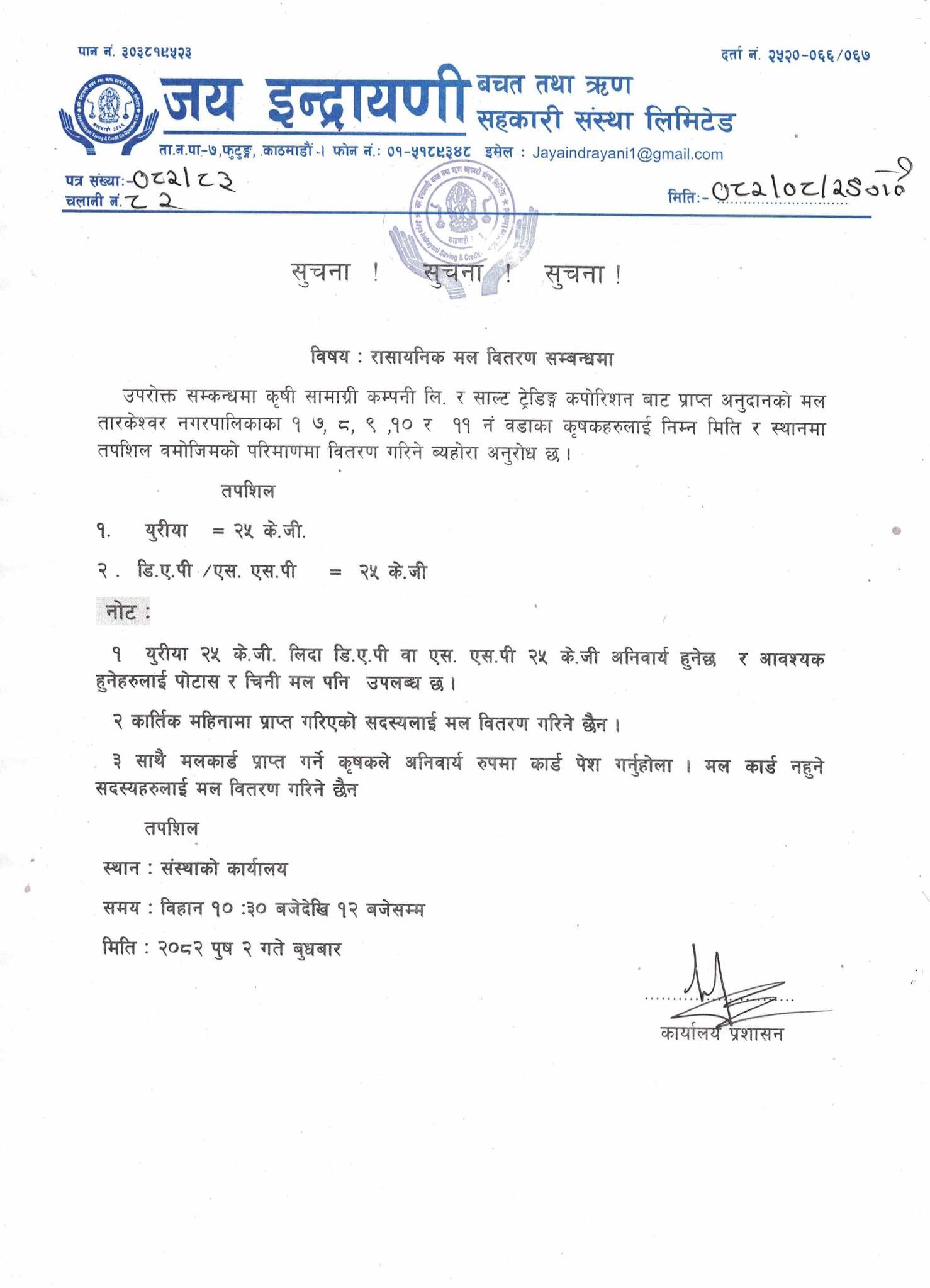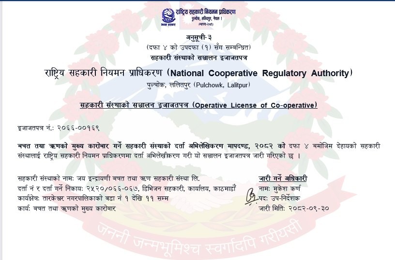 नेपालमा सहकारी अभियानको विभिन्न चरणहरुका बावजुद २०४६ सालको प्रजातन्त्रको पुर्नस्थपना पश्चात सहकारी ऐन २०४८ जारी भयो र सहकारी संस्थाहरुको विकासको लहर तदारुकताका साथ आयो । मुलुकमा थुप्रै सहकारी संस्थाहरु विभिन्न प्रकारका एकल उद्देश्य तथा बहुउद्देश्य सहकारी संंस्थाहरुको स्थापना र सञ्चालन हुन शुरु भयो । यसै शिलशिलामा फुटुङ्ग, साङ्गला ,मनमैजु , धर्मस्थली र काभ्रेस्थली कार्यक्षेत्र रहेने गरी तात्कालीन ५ गा. वि. स. का २८ जना व्यक्तिहरु मिलेर २०६६ सालमा जय ईन्द्रायणी वचत तथा ऋण सहकारी संस्था स्थापना भयो ।
