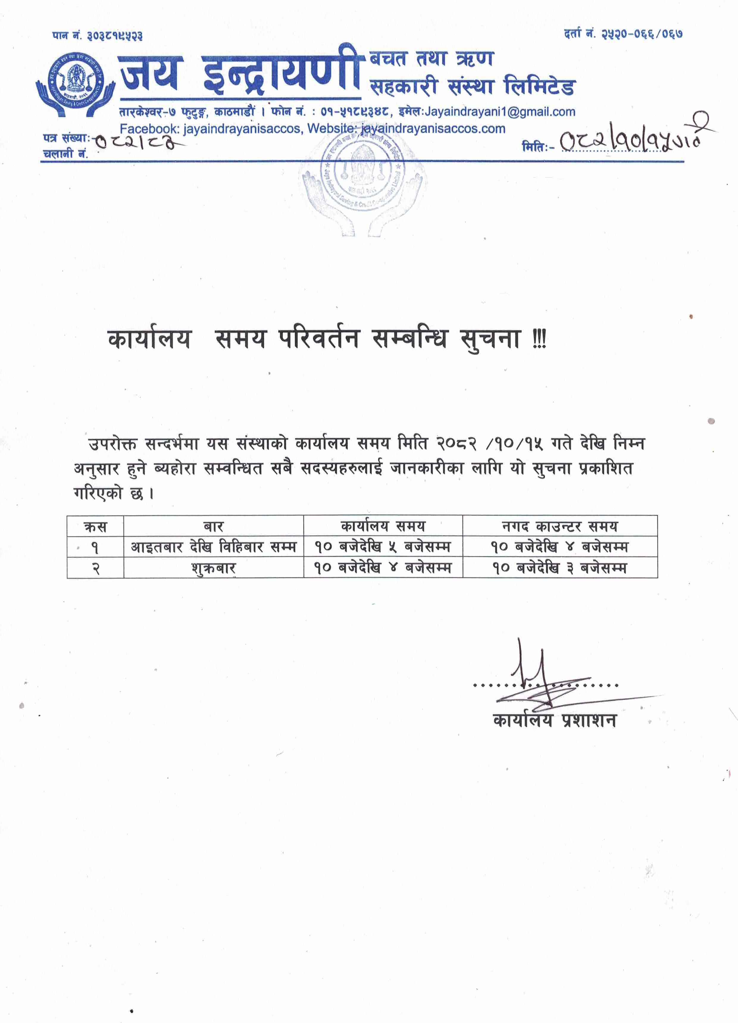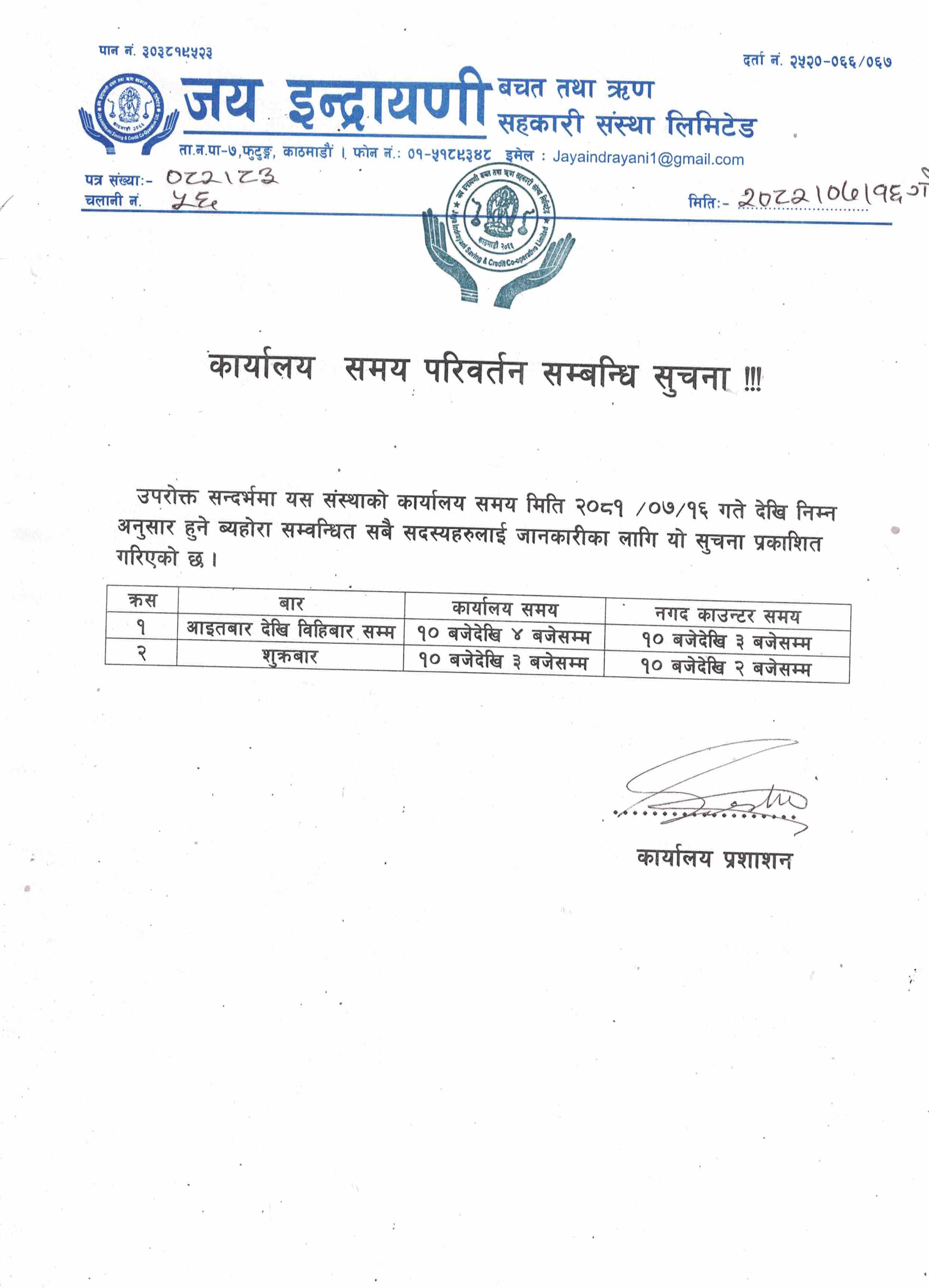नेपालमा सहकारी अभियानको विभिन्न चरणहरुका बावजुद २०४६ सालको प्रजातन्त्रको पुर्नस्थपना पश्चात सहकारी ऐन २०४८ जारी भयो र सहकारी संस्थाहरुको विकासको लहर तदारुकताका साथ आयो । मुलुकमा थुप्रै सहकारी संस्थाहरु विभिन्न प्रकारका एकल उद्देश्य तथा बहुउद्देश्य सहकारी संंस्थाहरुको स्थापना र सञ्चालन हुन शुरु भयो । यसै शिलशिलामा फुटुङ्ग, साङ्गला ,मनमैजु , धर्मस्थली र काभ्रेस्थली कार्यक्षेत्र रहेने गरी तात्कालीन ५ गा. वि. स. का २८ जना व्यक्तिहरु मिलेर २०६६ सालमा जय ईन्द्रायणी वचत तथा ऋण सहकारी संस्था स्थापना भयो ।
